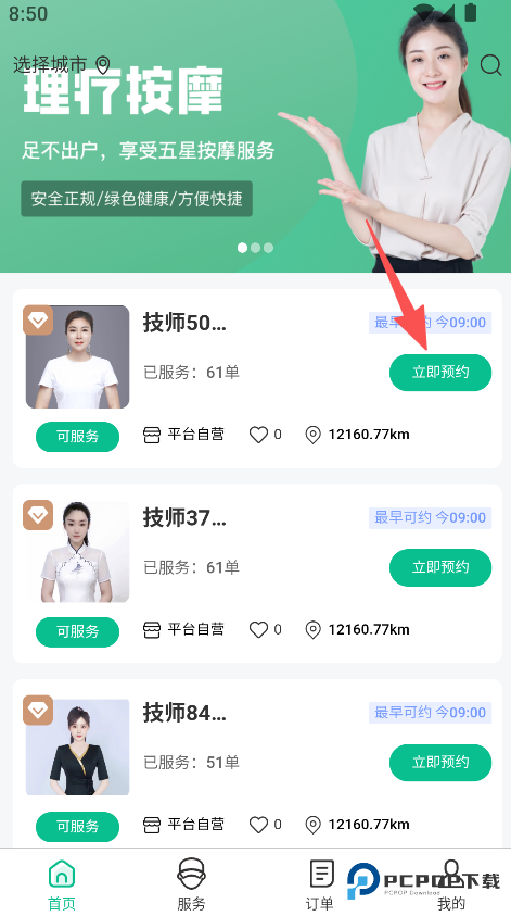 2、技师信息透明 ,服务单数可预约时间清晰 ,选择对应按摩项目 ,匹配对应区域的技师资源,提升理疗服务的便捷性与舒适度。打开忆悦到家首页,